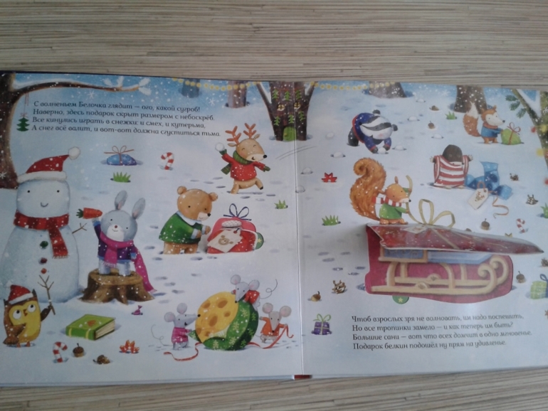 Книга у нас с прошлого года, но сейчас дочка ее оценит в полной мере. Замечательная подборка стихов и песенок Новогодней тематики. Пухлая обложка с блестками и блестящими буквами смотрится очень празднично и уместно. Окошки сделаны очень просто - наклеены сверху листа достаточно тонкие элементы. Никакой многослойности страниц. Но нам хватило аккуратности даже в 1,5 годика их не оторвать.