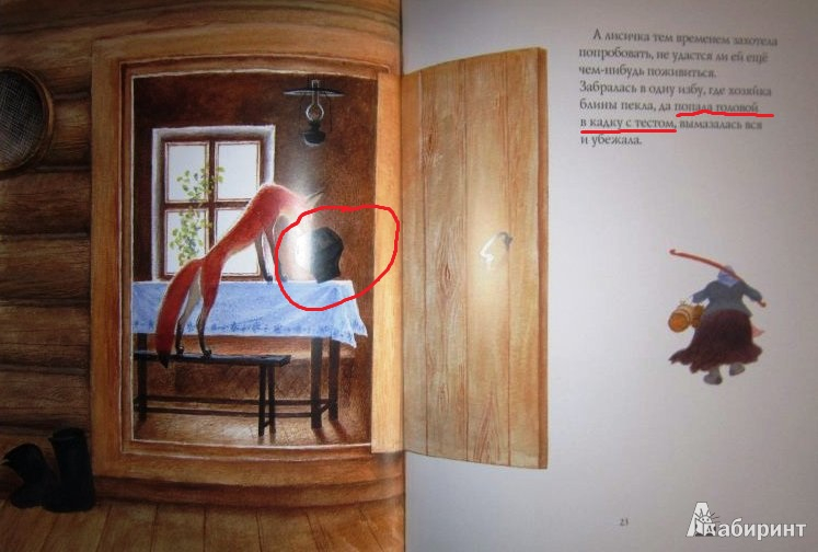 Я тоже этот "калачик" сразу же заметила. Пришлось сократить до "видит: лежит лисичка на дороге". Так и читаю. Именно "кадку" не увидела, но на то, что нарисовано одно, а написано совсем другое, обратила внимание. На картинке никто никуда случайно и не собирается угождать, а спокойно наворачивает из чугунка. Мне тоже стало обидно, что при таких прекрасных иллюстрациях, к тексту отнеслись как-то спустя рукава.