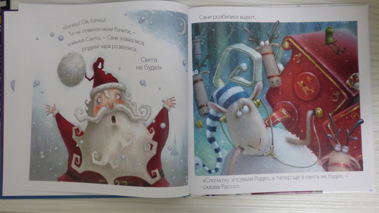 "Видишь! Ой, видишь! Ты не должен меня видеть,- воскликнул Санта.-Сани сломались, рождественское волшебство разваливается. Праздника не будет!" Сани разбились в дребезги. "Сначала испортили Рождество, а теперь еще и праздника не будет",-сказал Рассел.