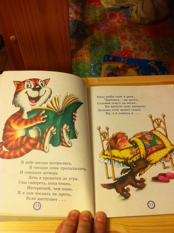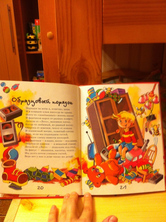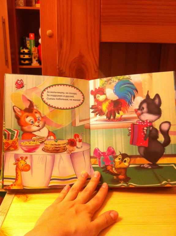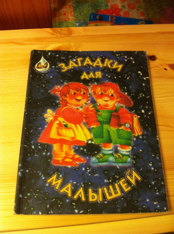 А эта книга перешла к нам по наследству от моей сестры... Что в ней хорошего, так это то, что она действительно для малышей, простые крупные цветные картинки(подсказки) и загадки - стихи с рифмованным окончанием. Но это наверное пригодится когда дети говорить будут...