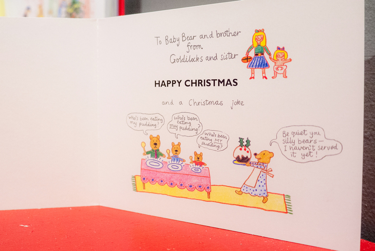 Тут шутка на открытке плохо читаемая, поэтому я на всякий случай переведу. (Каждый из медведей, сидящих за столом, спрашивает. Кто съел мой пирог? А мама, входящая в комнату, говорит: Не волнуйтсь. Я его еще только несу.)