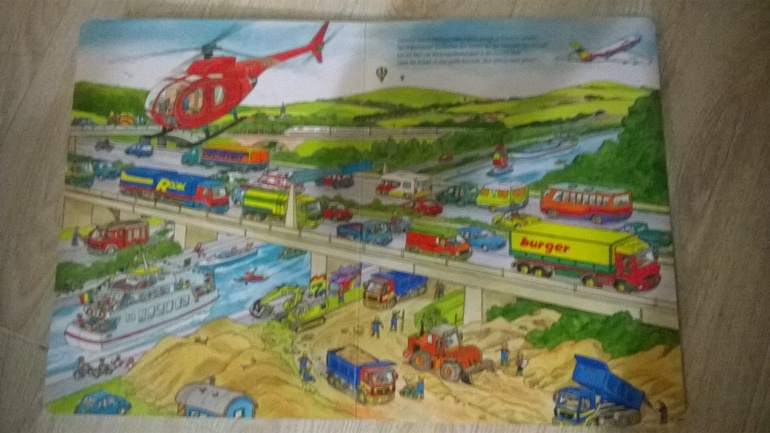 Малявке (1,5 года) пока нравится перелистывать толстенные страницы виммельбуха. Особо внимательно в картинки она еще не вглядывается, но, если замечает что-то знакомое, тычет пальчиком и болтает что-то на своем малышовском языке.