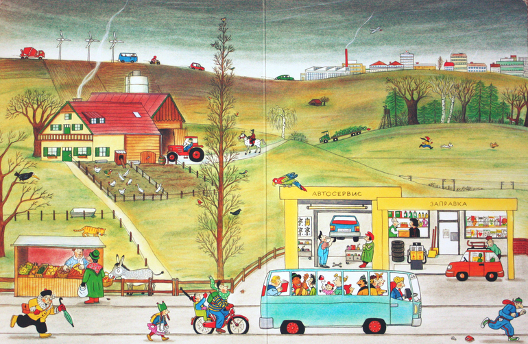 Если честно, я совершенно не собиралась покупать эту серию, так как по разворотам выложенным в интернете мне она не особенно нравилась: примитивный рисунок, неправильная перспектива.... Есть гораздо интереснее и красивей виммельбухи чем этот, стоит ли тратить деньги?! Но когда, таки купив первую книжку, открыла ее - мнение мое переменилось на ее счет. Во-первых, сюжет книги понятный городскому малышу уже на первом году его жизни - многоквартирный дом (малоэтажной застройки), частный сектор с высотками на горизонте, вокзал электропоездов, торговый центр, центральная площадь, и развлечения - в данном случае, каток. Этот момент на мой взгляд важен, так как формирует связь между жизнью и книгой, т.е. жизнь (окружающая действительность) - первична, книга вторична - все так и должно быть. Я считаю, что книга прежде всего источник знания, а не узнавания жизни (для совсем маленького малыша). Ну и вернувшись к предмету обсуждения, отмечу очень красивую цветовую гамму, именно этот момент совершенно не отражают фотографии в интернете. Мои развороты тоже получились не ахти, как я не старалась поднять цвета(( поэтому буду рассказывать и пояснять))