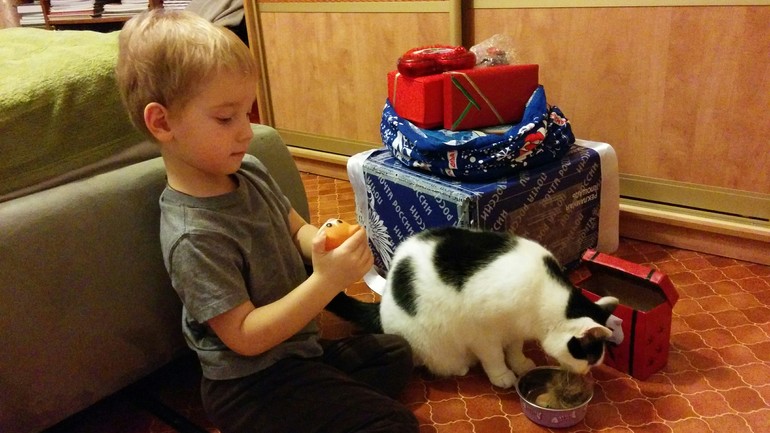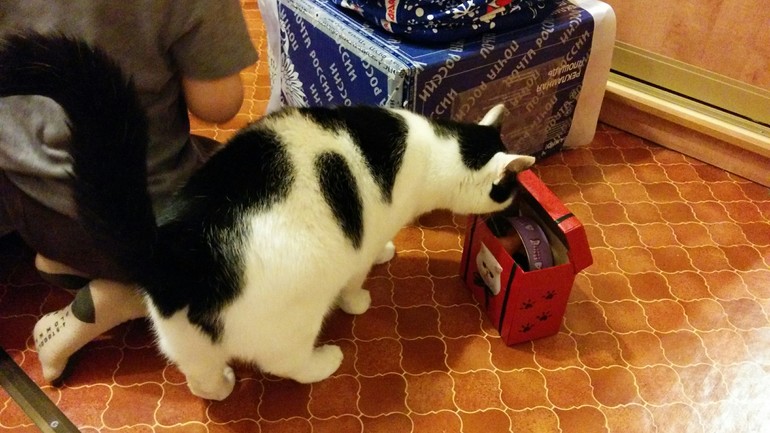Посовещавшись с сыном, решили первым открыть и отдать подарочек нашему нетерпеливому коту
