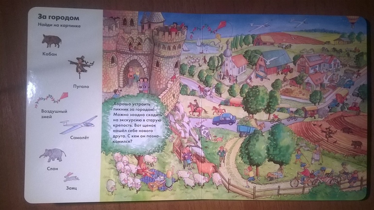 Что здесь прикольно, так это отдельные изображения нескольких предметов на краю страницы, ребенку проще увидеть и запомнить, когда нарисовано отдельно. Ну и задание есть на каждом развороте: с кем познакомился щенок? Где оставили куклу? и т.п.