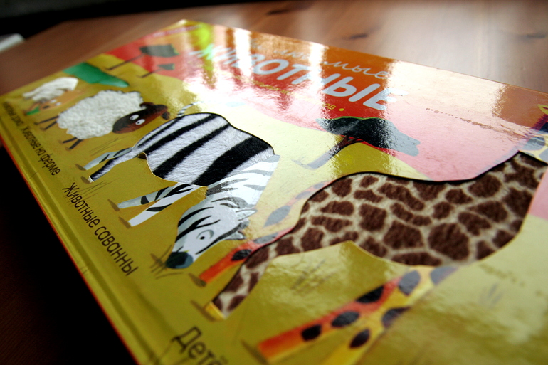Этот сборник включает четыре книжки - животные дома, животные на ферме, животные саванны и детеныши. Каждый разворот посвящен какому-то одному животному. На странице слева - название животного, его компьютерное изображение (так себе, конечно, но в целом ничего) и какие-нибудь интересные факты об этом животном. На странице справа - фотография животного с дыркой, через которую торчит кусочек его кожи/ меха/ перьев. Тут можно вдоволь наковыряться.