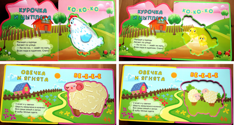 Это книга-пазл. Изображение животного можно вытащить и обнаружить, что под ним скрываются детки этого животного. Сверху написано, как животное разговаривает, а слева - стишок, в котором упоминаются и животное-родитель, и животное-детеныш. Пазл выковыривается хорошо.