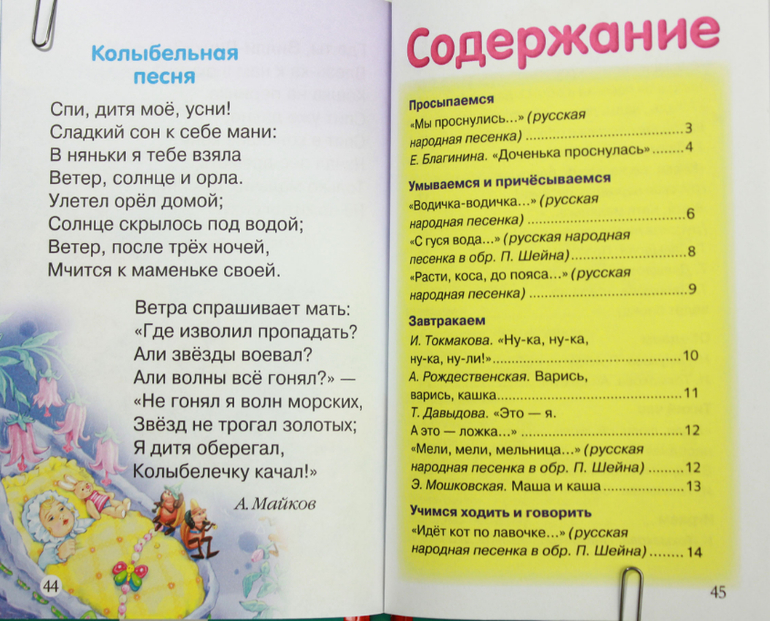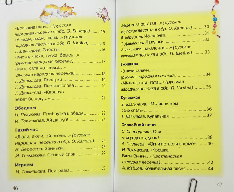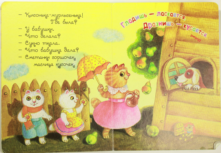 В книжке пестушки и потешки замечательные. Они разделены на разделы: просыпаемся, умываемся и причесываемся, завтракаем, учимся ходить и говорить, обедаем, тихий час, играем, ужинаем, купаемся, спокойной ночи. Мама в любой ситуации и в любом возрасте будет разговаривать со своим ребеночком на этом удивительном и волшебном языке пестушек. У нас эта книжка появилась в 1.4, и хотя большинство потешек и пестушек я знала, и постоянно их дочке рассказывала, после появления той книжки в доме я расширила свой репертуар. Дочка книжку любит, сидит слушает и рассматривает картинки. Хотя последние не самые лучшие и будь моя воля я бы их заменила. Некоторые есть вообще "шедевральные" - проф-пресс отдыхает! Но таких там три штуки, а в остальном очень полезная книжка и для родителей и для детей. Дальше покажу подробнее: