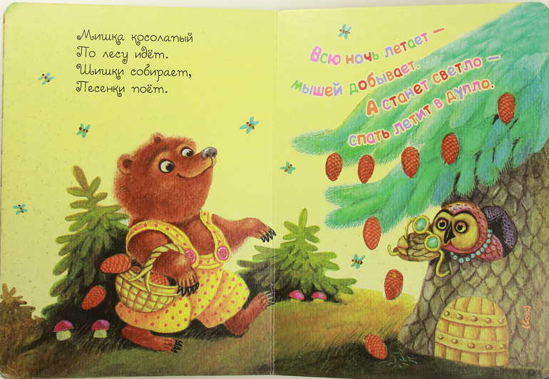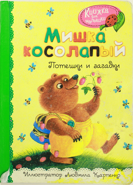 Самой первой у нас появилась книжка "Мишка косолапый" с иллюстрациями Л. Карпенко. Доченька моя эту книжку заприметила сразу и постоянно просила ей ее показывать. Мне самой эта книжка не очень нравится, т.к. иллюстрации в ней какие-то повторяющиеся. Вроде бы и не компьютерные....Сами по себе иллюстрации не плохие и запоминающиеся. Но мишка кочует с обложки на страницу, кошечки тоже повторяются. Потешки в книжке мне сначала также не очень понравились, но дочка просила ей эту книжку показывать еще и еще. И теперь уже вроде и привыкла к ним, и запомнила, и полюбила)))). На фоне многочисленных подаренных картонок от проф-пресса эта книжка выгодно от них отличалась, может поэтому попала в любимчики ребенка и осталась в нашей библиотеке. Книжка эта уже заметно потрепалась,т.к. не расстаемся мы с ней с годика. Ниже покажу всю книжку целиком.