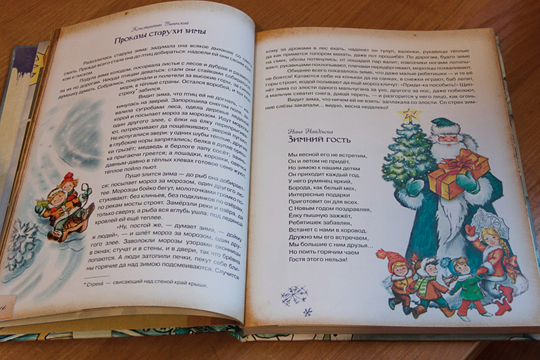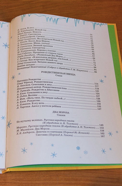 Отличный сборник стихов и прочего новогоднего. Я, например, каждый год роюсь в инете в поисках стихов на новогоднюю тематику для Леры. Ведь все время приходится учить на праздники. А здесь, что меня и привлекло, отличная подборка классических новогодних стихов. При чем можно найти на любой возраст! Хорошая белая бумага. Иллюстрации на каждой странице, но не забивают текст.