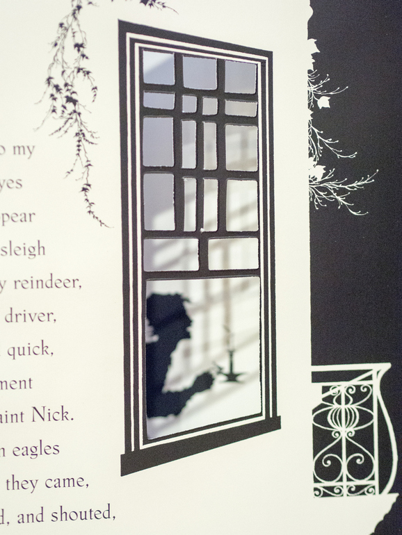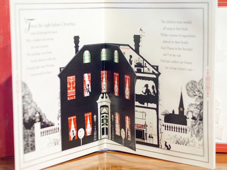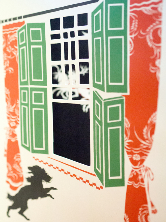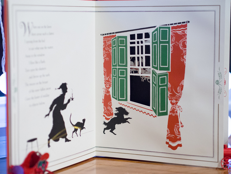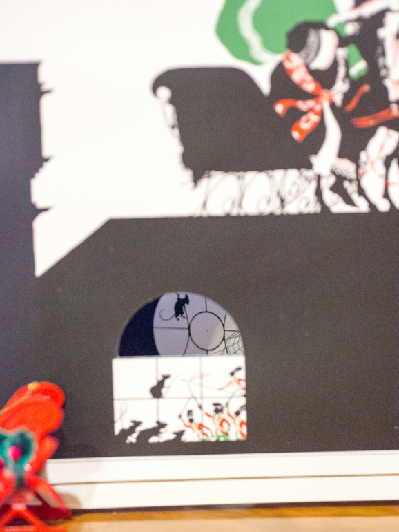 На многих разворотах есть возможность подглядывать сквозь окна, двери на предыдущую или следующую страницу. Особенно интересно это делать мееееедленно переворачивая плотные картонные странички, тогда силуэты в окнах меняются: приближаются, удаляются, оживают, честное слово…