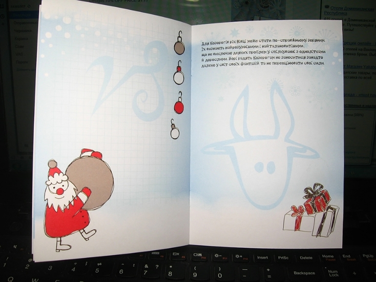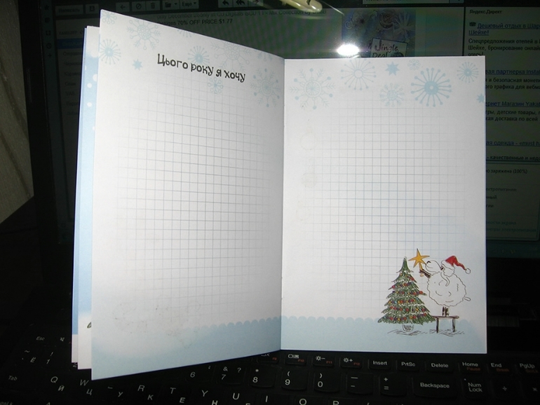 В книжке с овечкой короткие гороскопы для знаков зодиака и тематические странички для записей "Мои мечты", "В этом году я хочу" "Новогодние поздравления"и т.п.