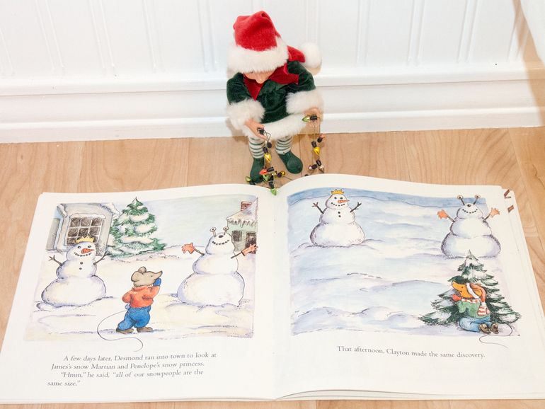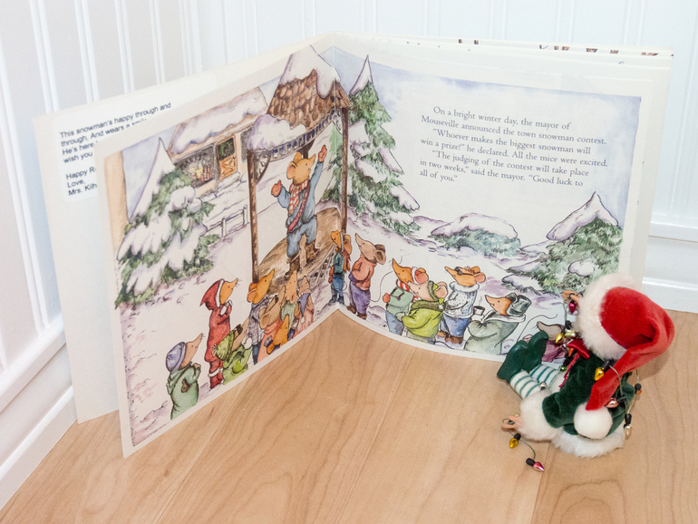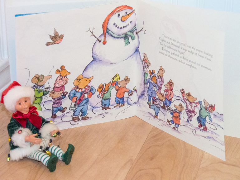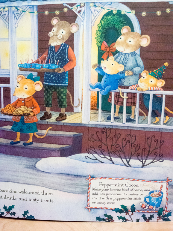 Большая мышиная семья, вместе с другими жителями мышиного города активно готовится к празднику. Украшает елку, выпекает вкусные печенья, заворачивает подарки, слушает песнопения, посещаяет праздничные мероприятия, катается на коньках и санках, накрывает стол к рождественскому вечеру, разворачивают подарки, в общем, делает все, что нужно, чтобы правильно встретить новый год. Примечательна книга тем, что она не просто рассказывает о том, что делают мышата, но и позволяет читателям сделать то же самое.