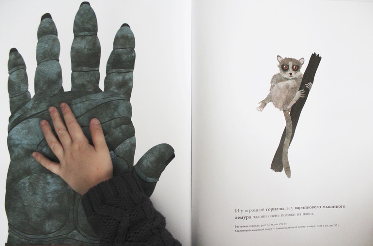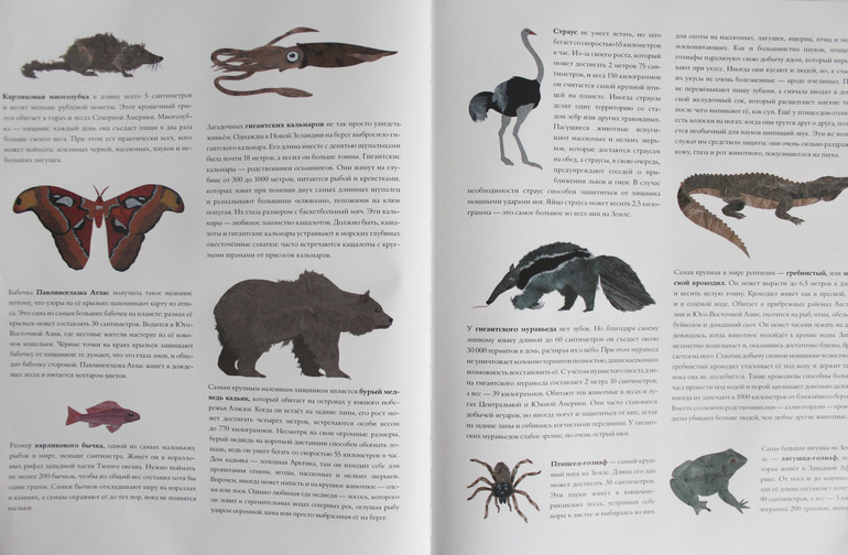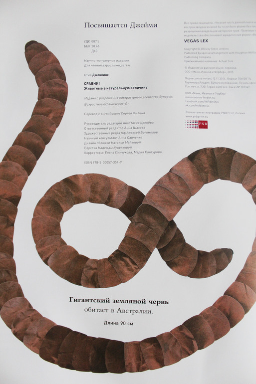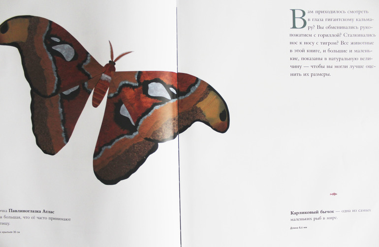 "Вам приходилось смотреть в глаза гигантскому кальмару? вы обменивались рукопожатием с гориллой? Сталкивались нос к носу с тигром? Все животные в этой книге, и большие и маленькие, показаны в натуральную величину - чтобы вы могли лучше оценить их размеры."