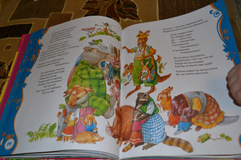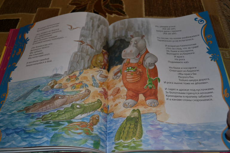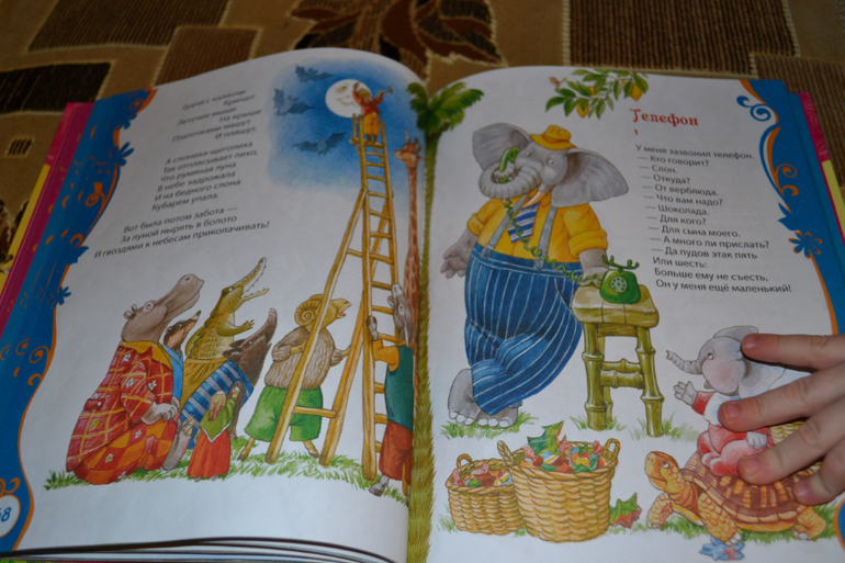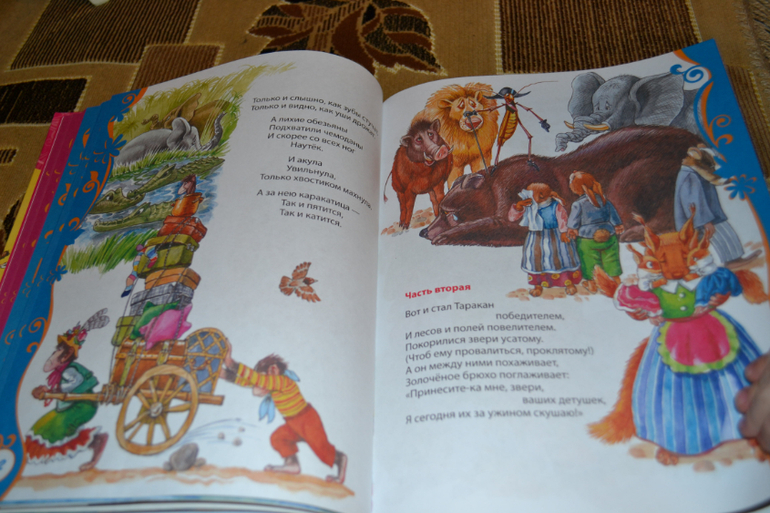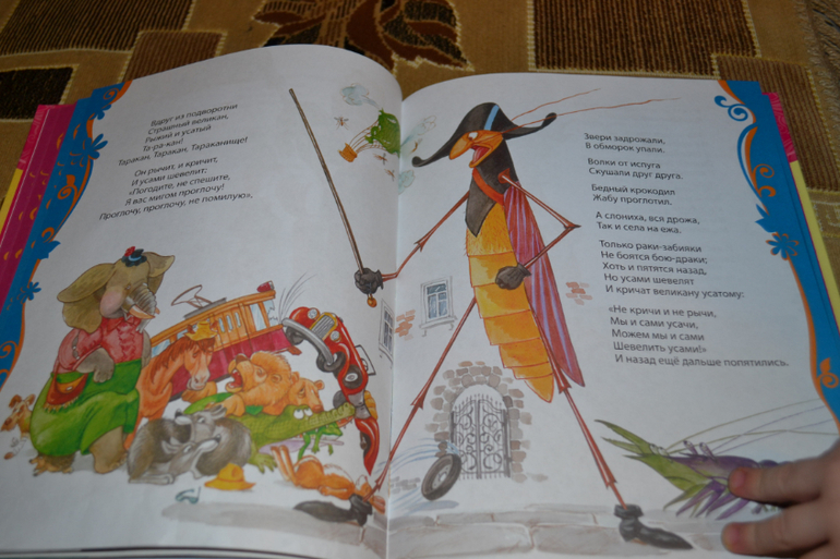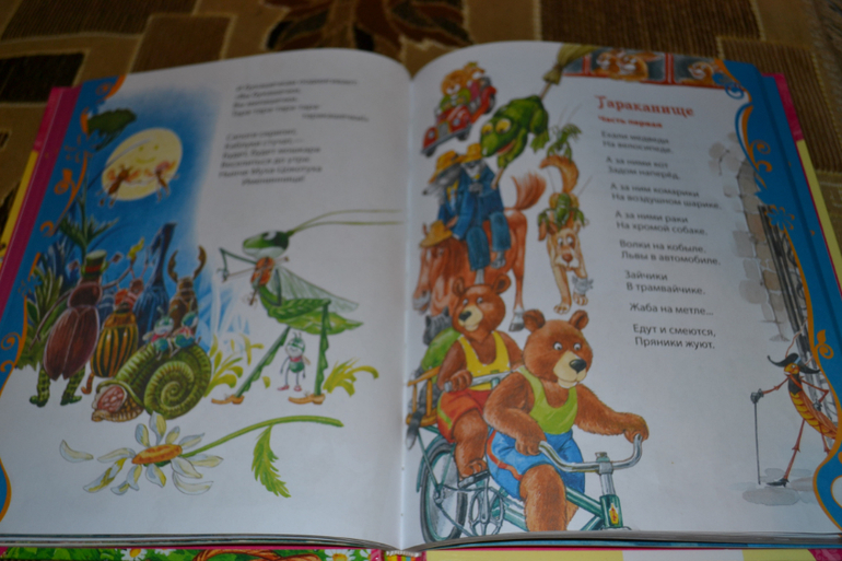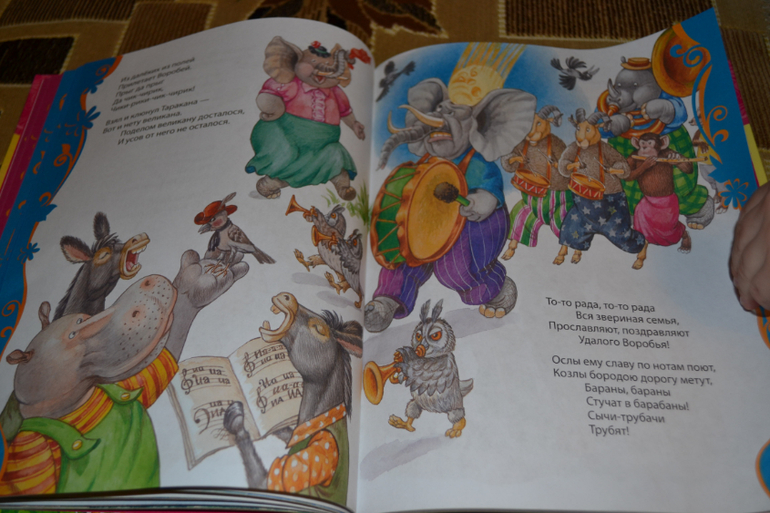 Эту книгу нам подарили и, честно скажу, поначалу мне хотелось её кому-то передарить или просто спрятать от сына, т. к. она меня жутко раздражала.Ну совсем не такими я представляла себе героев любимого нами с сыном Чуковского.Некоторые иллюстрации откровенно страшные даже для меня...У нас есть Чуковский в отдельной букинистике с иллюстрациями Сутеева (этот вариант мне ближе всего) и в сборнике разных авторов с иллюстрациями того же Сутеева.Но, к сожалению, Сутеев проиллюстрировал не все произведения Чуковского...Был у нас ещё компьютерный вариант от РООССы, который я отнесла в сад.Поэтому, делать нечего, стали читать этот.Сына, кстати, книга ничем не смущала.Ему главное, чтобы всё, о чём речь в сказке, было подробно проиллюстрировано, а в этом плане книга уступает наверное только лишь Сутееву.Приятной неожиданностью в сборнике стало наличие стихов (по мне бредовых, но сыну понравились) Чуковского, которых у нас не было.Сейчас к книге я попривыкла, читаю её уже без отвращения, и считаю, что этот вариант не так уж и плох, особенно с тем качеством печати и за такую цену) К слову, любимым произведением Чуковского у сына остаётся "Тараканище", которое он знает наизусть)))