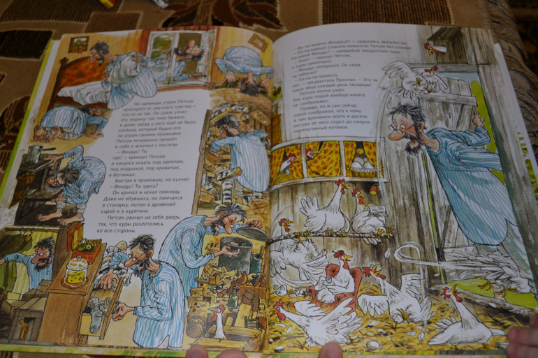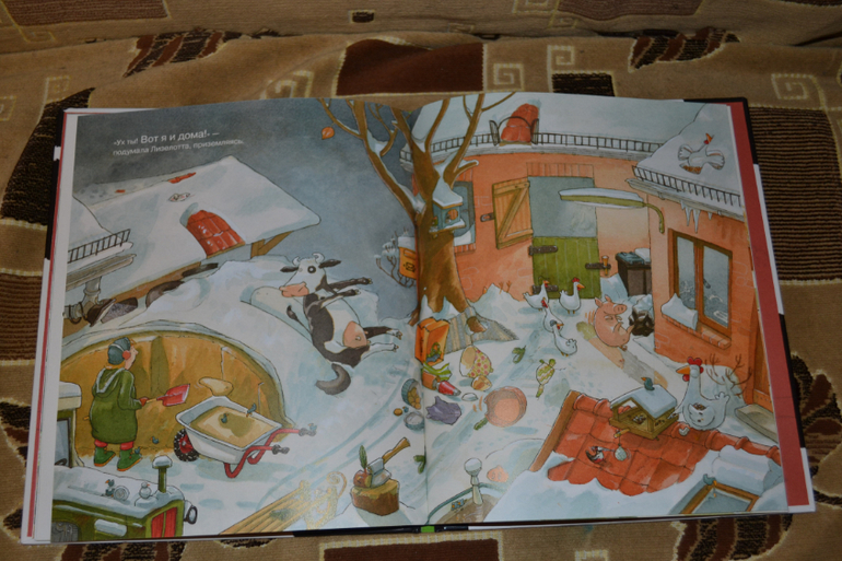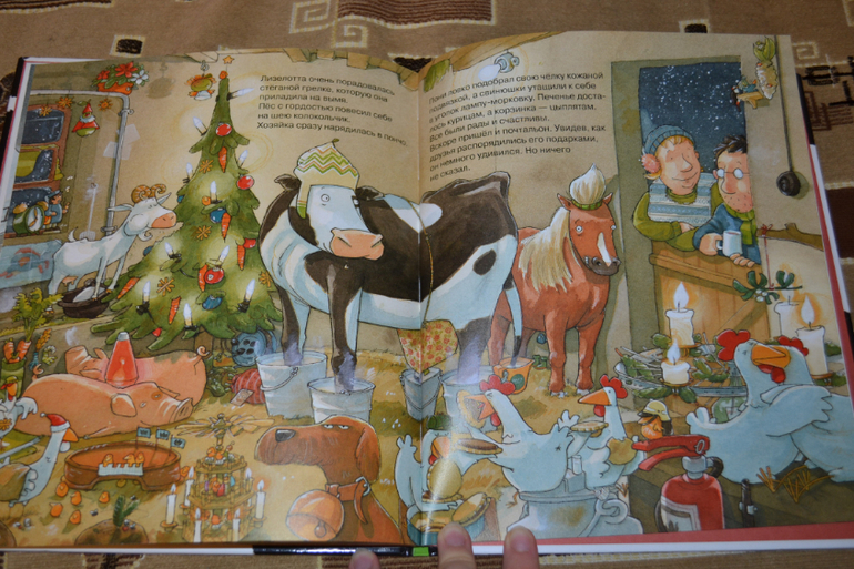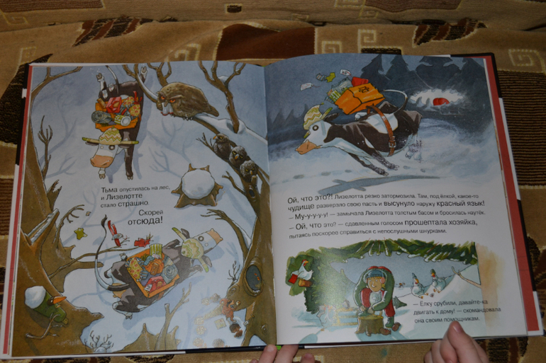 Эту же книгу, напротив, мы читали с сыном вдвоём с большим удовольствием!Хотя мы её не сразу поняли и полюбили.Знаю, что о Лизелотте неоднозначные отзывы.Людям она или очень нравится, что скупают всю серию (что я, вероятно, и сделаю), или не нравится категорически ничем.Объясню наш с сыном восторг.Да, согласна, сама история короткая, не несёт какой-то особой смысловой нагрузки, да ещё и непонятная какая-то (я до сих пор не понимаю, почему и как Лизелотта умудрилась заблудиться), НО она просто суперпозитивная!Одна из тех книг, которые способны поднять настроение)) Эту книгу нужно покупать из-за юмора, который по бОльшей части преподносится с помощью иллюстраций.Одни только куры чего стОят!!!Вот мы читаем книгу 2 месяца, и до сих пор я каждый раз нахожу какие-то новые интересные детали в иллюстрациях, и сыну очень нравится их разглядывать))) Для нас это если не хит, то как минимум очень любимая книга)))