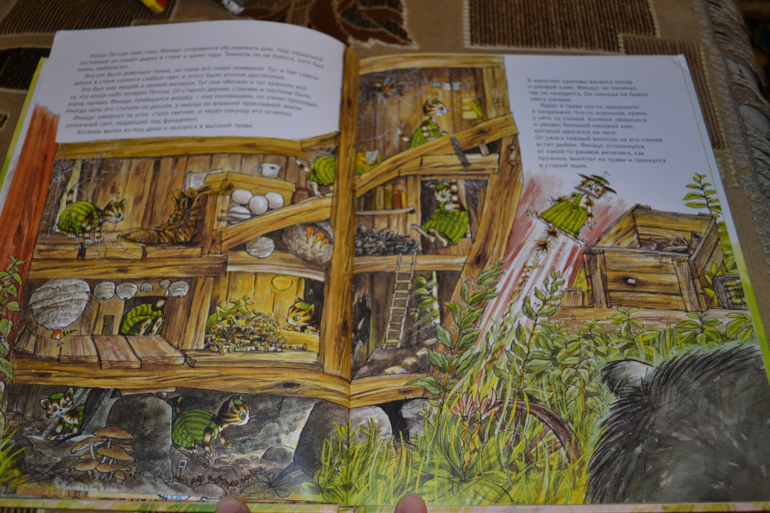 Знаю, что эта серия книга рассчитана на возраст постарше, но опять же благодаря мультикам мне удалось вызвать у сына пусть и недолгий, но интерес.Конечно, когда я читала эту и следующую книги, половину я сокращала, но всё равно истории пока ему не по возрасту.А вот иллюстрации разглядывать ему очень понравилось.Особенно в тех местах, где на одной странице герой изображён в динамике, и за его действиями можно проследить))