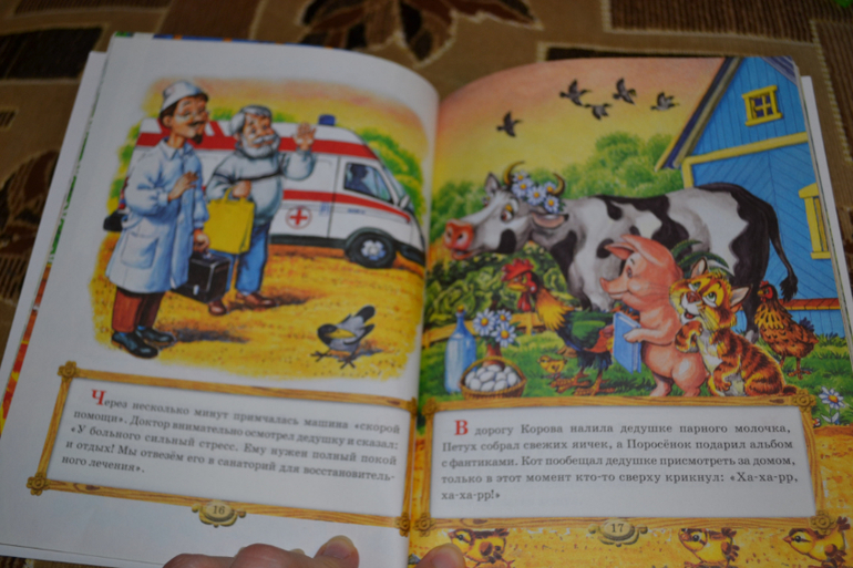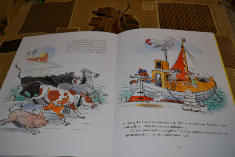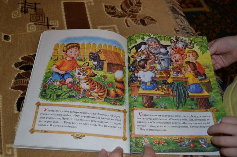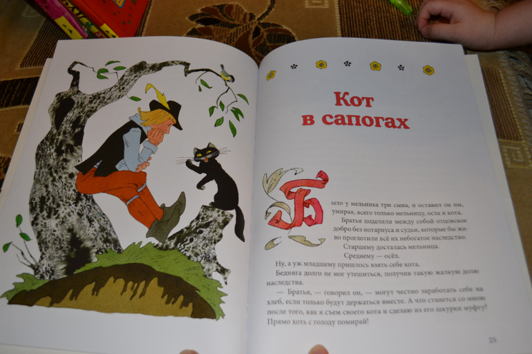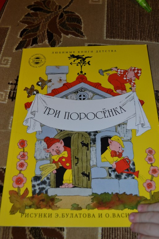 Эта книга вместе со стопочкой аналогичных была куплена мной некоторое время назад в фикс-прайсе из-за иллюстраций тандема двух небезызвестных художников. Книг с их иллюстрациями в нашем доме почему-то раньше не было (в том числе среди моей букинистики), поэтому я поторопилась набрать всё, что было.И пожалела.У этих книг особенные иллюстрации: там, где идёт текст, иллюстрации даны очень мелко сверху и снизу разворота, а потом иллюстрация на целый разворот, но совсем без текста.Читать такие книги ребёнку возраста моего сына очень тяжело, особенно когда ещё текст опережает иллюстрации, как в этой книге и книге "Красная шапочка"((( Сам вариант этих "Трёх поросят" мне не близок.Но в этой книге мы читаем чаще всего вторую сказку - "Кот в сапогах".С текстом тут всё нормально, но мучаемся с сыном с этими иллюстрациями((( Есть у нас ещё букинистический "Кот в сапогах", который я показывала здесь , читаем и тот, и тот.Не очень люблю эту сказку, но сыну нравится.Хотя я подозреваю, что он понимает далеко не весь её смысл...)
