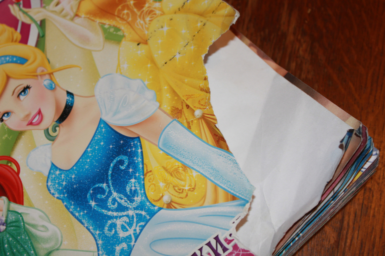 Моя малышка очень уважает печатную литературу. Как только она видит кого-то с книгой, журналом, важным заявлением или рулоном бумажных полотенец, она уже тут как тут. Ни одна бумажка не ускользнет от пристального внимания и будет детально изучена и испробована (в прямом смысле). Так, в декабре, например, наибольшей любовью пользовались "Принцессы Диснея" от Эгмонт, которые ввиду своей неформатной величины стояли около тумбочки, откуда постоянно извлекались