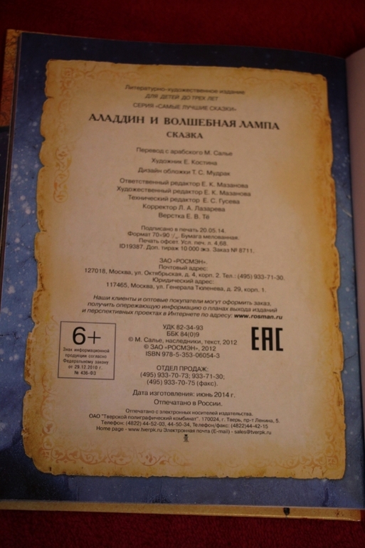В Лабиринте Росмена нет, в озоне с этим isbn нет, но есть Аладдин серийный (аналогично в май-шопе и риде). Серию Детская библиотека Росмэн не все любят, покажу моего Аладдина с уникальной собственной обложкой.