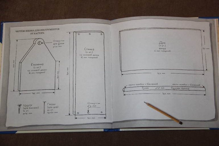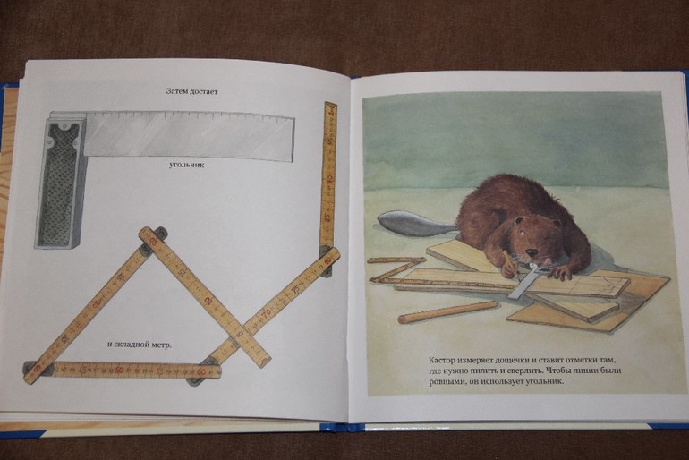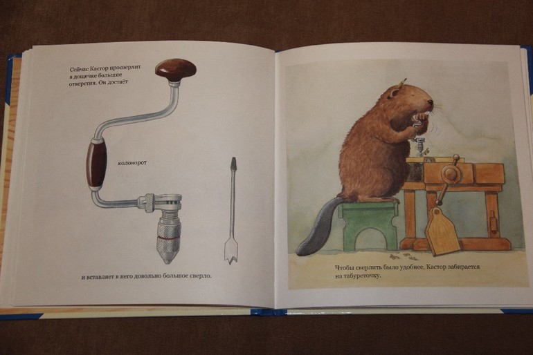 А книга о том, как Кастор мастерит ящик для инструментов - с пошаговой инструкцией. с чертежом самого ящика и крупными изображениями инструмента, который бобру нужен на каждом этапе изготовления ящика.