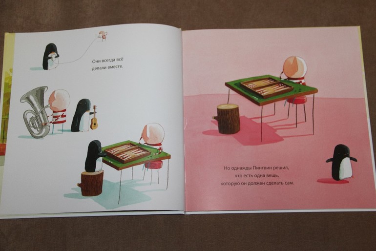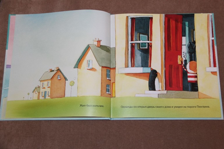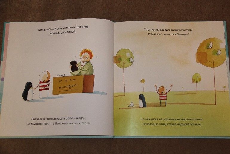 В первой книге - мальчик и пингвин только знакомятся, мальчик думал, что пингвин потерялся и повез его домой, а оказалось, что пингвин был просто одинок и ему нужен был друг. А во второй части пингвин учился летать, это конечно не совсем физиологично для пингвина, но уж если очень хочется... то можно и пушкой ускорения придать ) Понравились книги обе, настроение у них разное, но обе хорошие.