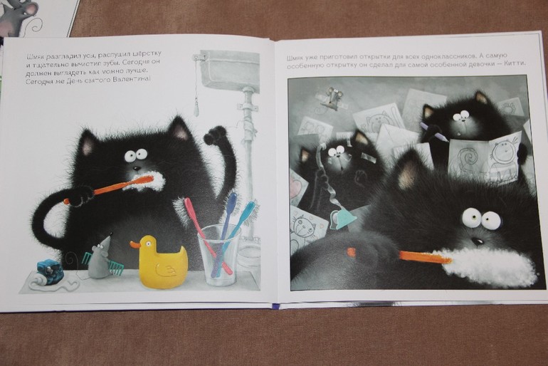 А вот третья книжка странная, вернее она не такая уж и странная, но не совсем тема по возрасту ) Прочитал конечно, но смысл не особо дошел... Вопросы были что-то вроде "А зачем она его тыкала пальцем в живот?", ну дело ясное - от большой любви, но Глебке пока это непонятно ). В книге Шмяк приготовил валентинку кошечке, которая ему нравилась, но никак не решался подарить, он же ей не нравиться как ему казалось - она его тыкает в живот, обзывает и всячески не дает нормально жить )))... А оказалось то совсем даже наоборот... вот тут вообще у Глеба была полная нестыковка. Вообщем он эту книгу забраковал пока.