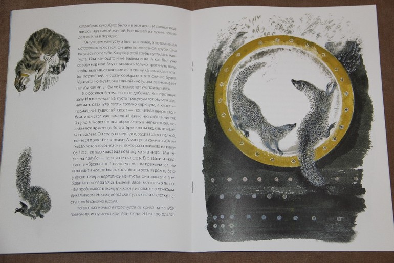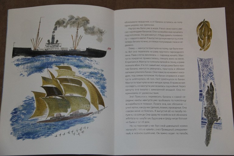 Я предложила почитать, сказав, что автор тот же, что написал про зайчат-листопадничков (читали в прошло месяце). Глеб не очень хотел, про зверей и природу не его тема, но книжка все таки была прочитана и очень сыну понравилась. Очень! Сказал, что мангусты смешные. Особенно запомнился момент, когда мангуст пытался стащить бананы, подвешанные под потолком каюты. И конечно последний эпизод сражения со змеей впечатлил.