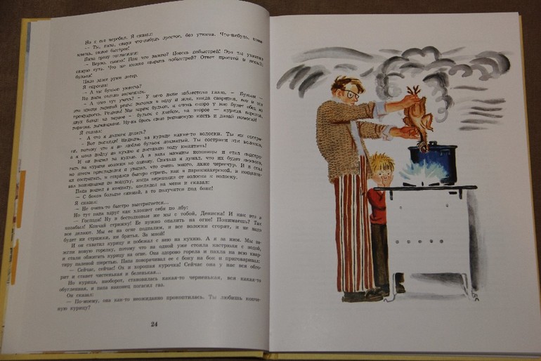 Из минусов этого издания - шрифт довольно мелкий. Иллюстрации отличные, хотя Дениска в разных рассказах выглядит по-разному, иногда даже его образ меняется на протяжении одного рассказа, но на это внимание обратила только я, а Глеба такие нюансы вообще пока не волнуют - ему просто смешно )