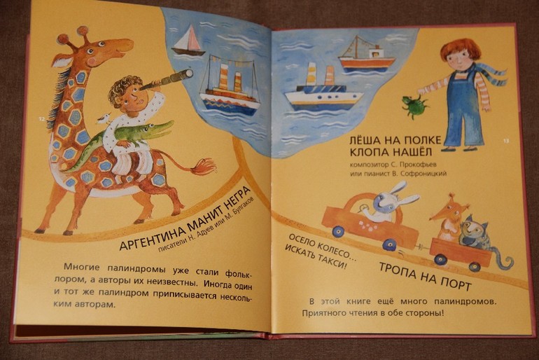 Ребенок сделал открытие - оказывается, если прочитать слово "сон" наоборот, то получиться другое слово - "нос". Так удивлен был! Ведь сам догадался прочитать наоборот и у него еще и слово получилось, а не абракадабра. Назвал его "двойным словом". И был еще более удивлен, что оказывается есть целые предложения, которые можно прочитать задом наперед и будет такое же предложение. И такое открытие сделали задолго до него, а по-научному такие слова/фразы/предложения/стихи называются "палиндромы". Книжка в общем то небольшой сборник подобных фраз с иллюстрациями Дарьи Герасимовой.