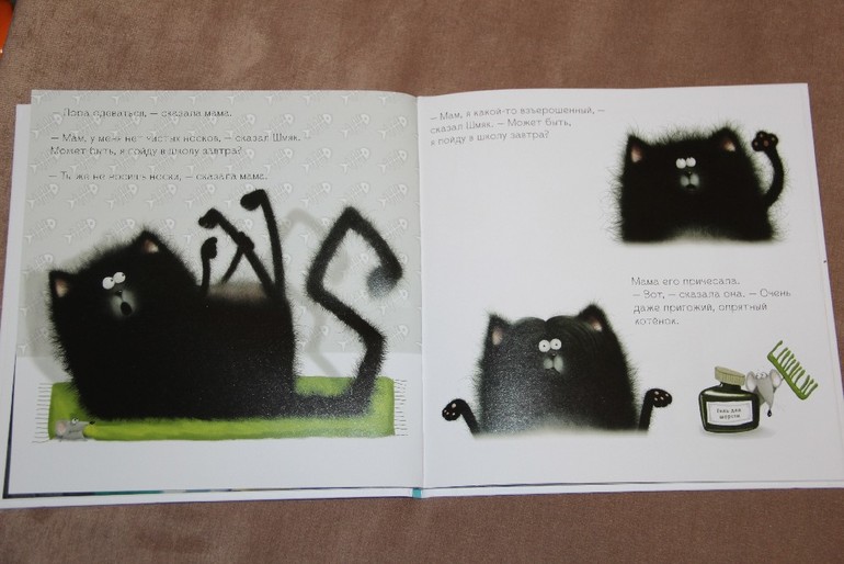 А вообще Шмяк как персонаж очень милый и нам очень понравился. У нас дома живет практически один в один такой же игрушечный котейка, как его звали я не очень помню, потому что до появления в нашем доме маленькой Даши, обожающей мягкие игрушки, Глебу до них вообще не было дела. А вот теперь нашего игрушечного черного котика Глеб переименовал в Шмяка и разве что не спит теперь с ним...