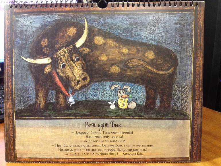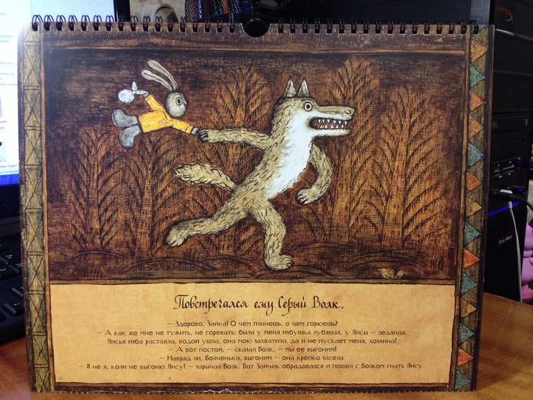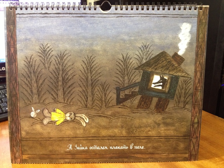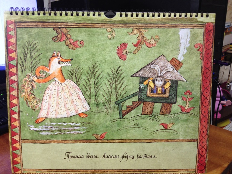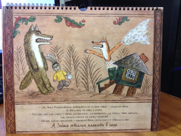 Календарь оказался на 2014 год, поэтому мы его быстренько оторвали и превратили в замечательную книгу. Про рисунки даже говорить не буду: столько там эмоций, в казалось бы примитивно переданных выражениях, что ребенку даже объяснять ничего не надо. Все и так понятно - Зайка очень грустит, звери страшные пугаются, как трусливые мышки, а Лиса Патрикеевна ну, и наглая же особа!