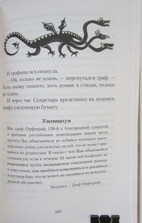 Ну вот дальше уже не могу молчать! Что в этой книге для меня минус - это оформление, рисунки. И да простит Василий Ермолаев, художник этой книги, его изображения происходящего к замку графа Орфографа не привлечёт никого. Хотя обложка вполне симпатичная. Но вот внутри: немногочисленные чёрно-белые рисунки только портят всё, просвечивая через не очень-то тонкий офсет. Такое оформление может быть рассчитано только на родителей и учителей, наверное...