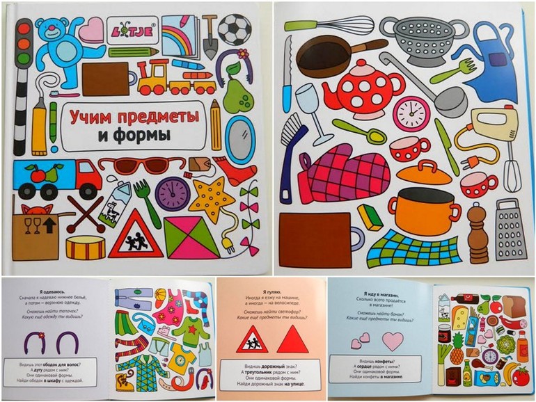 Ещё одна интересная книжка серии "Учим предметы и формы". Такие же яркие иллюстрации и интересные задания. Все предметы сгруппированы по темам: предметы кухни, одежда, машины, продукты и тд.