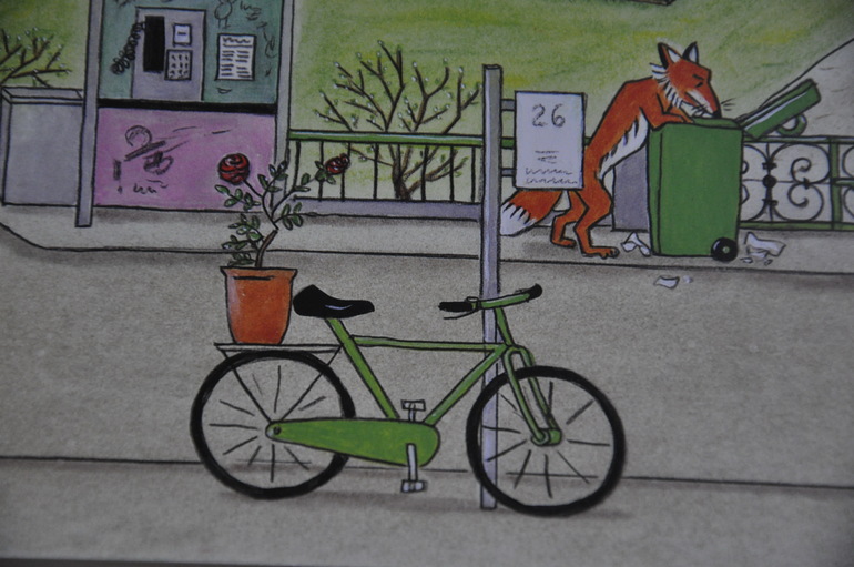 Вы спросите, где его велосипед? Велосипед аккуратно припаркован на улице (и розы с ним):