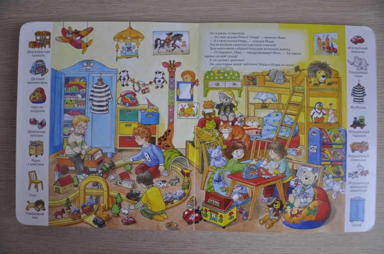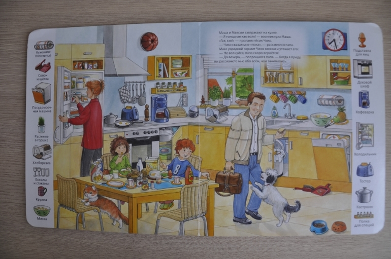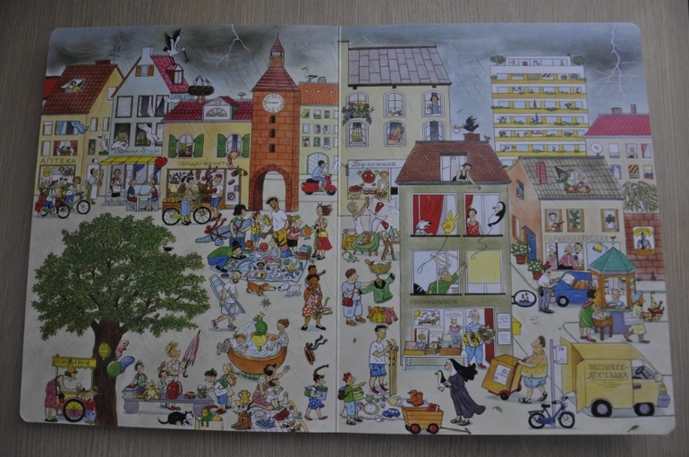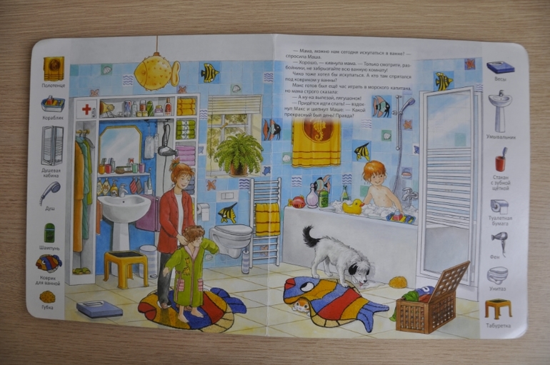 Ребенок часто ею занимается, но на мои просьбы "найди то-то" не реагирует, ищет только кота и собаку и радуется находке. Тема книги у нас не раскрыта:) Наша книга ещё и с браком, один и тот же разворот повторяется дважды (а того, чье место он занял не хватает).
