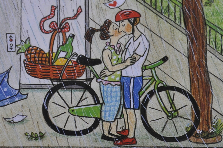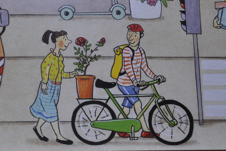 Парень на велике приметил девушку и уже мысленно решил по-джентльменски помочь ей с тяжёлой поклажей. На следующей странице это становится яснее, чем на предыдущей: