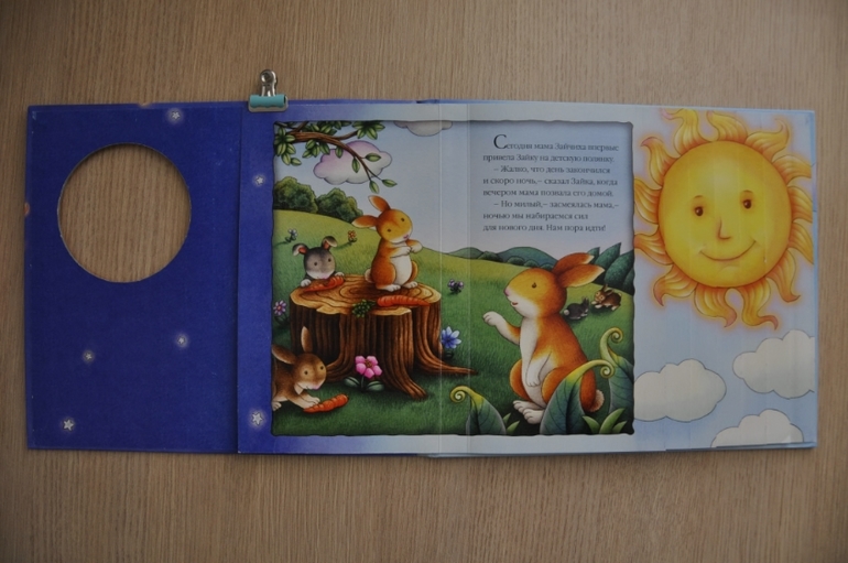 Спокойная, умиротворенная история об отходе зайки ко сну. Задумка самой книги нетривиальная, а вот текст простоват. Ребенок книгу любит, часто приносит. Правда, по мне так, картон тонковат, но, по-другому, может, нельзя было бы отразить эту смену дня и ночи: