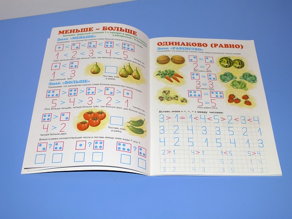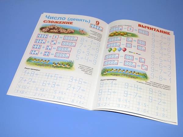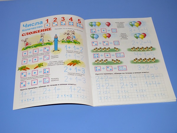 В пособии предлагается выполнить задания на сложение\вычитание\сравнение точек, различных предметов. Прописать по точкам примеры с цифрами. А так же написать ответ цифрой уже самостоятельно.