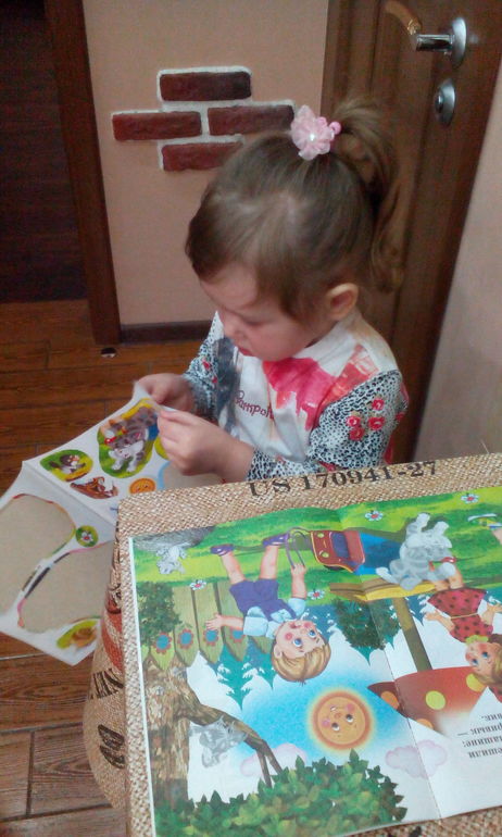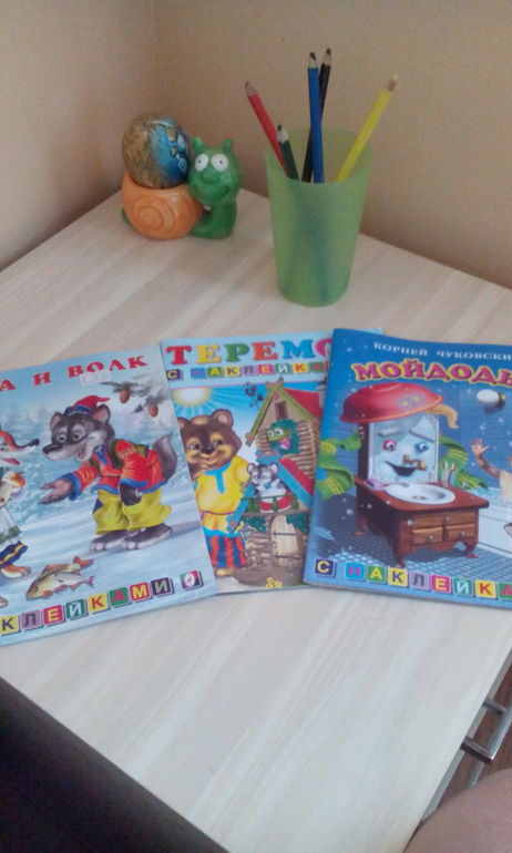 Эти малышки мы полюбили с первого взгляда.Рассматривать стали около годика,а наклеивать с 1.5 Книжки маленького формата и их удобно брать везде:в дорогу,на дачу, в поликлинику.Очень красивые иллюстрации Приходкин:милые,добрые.И очень большие наклейки,что удобно для малышей.Так мы играя очень быстро выучили все сказки.
