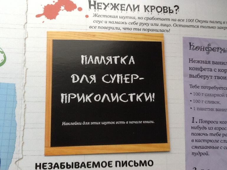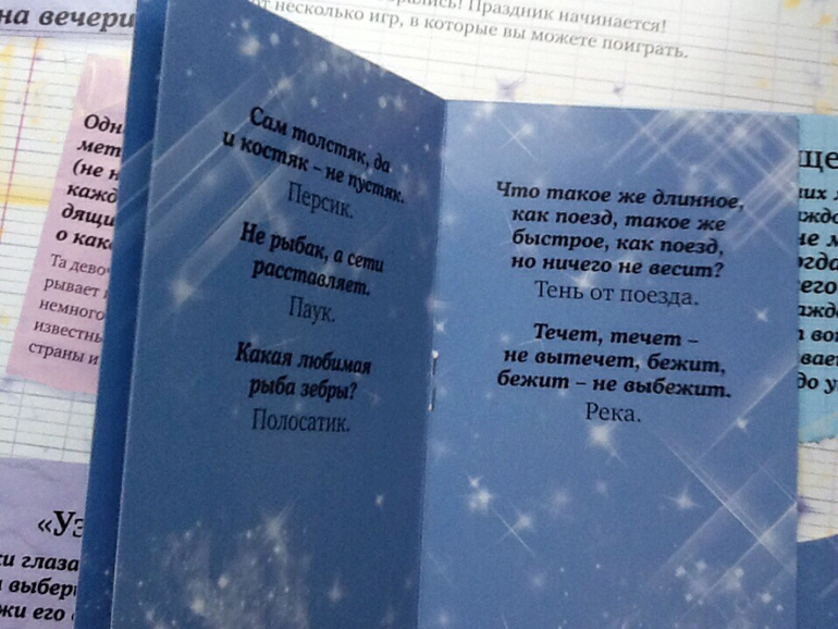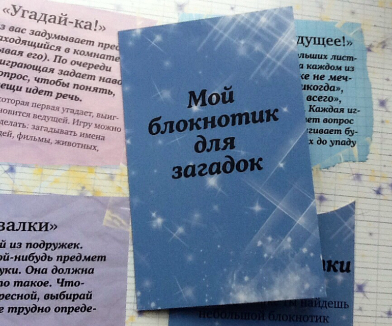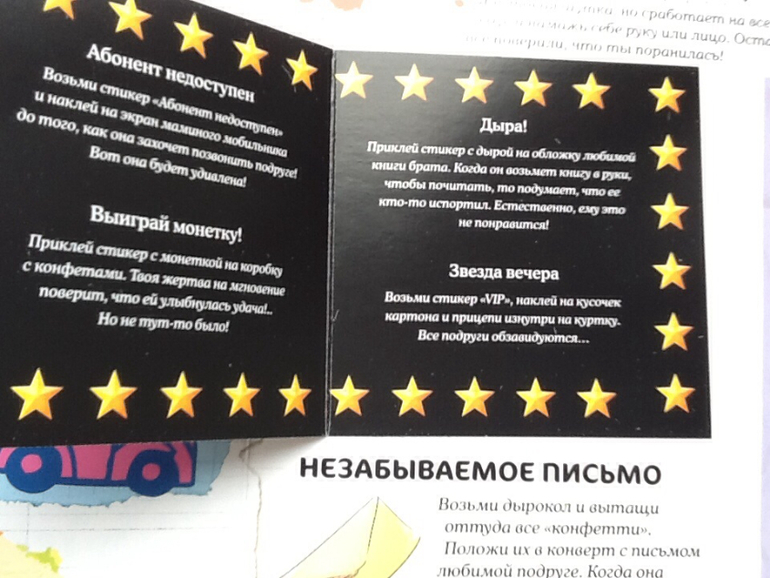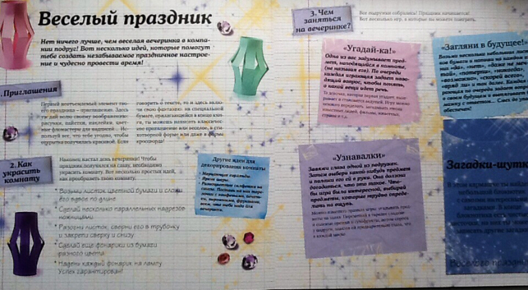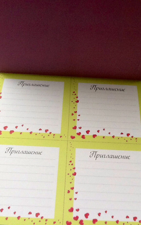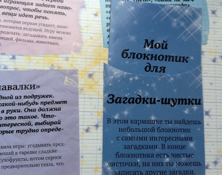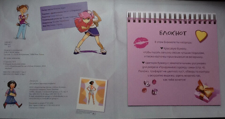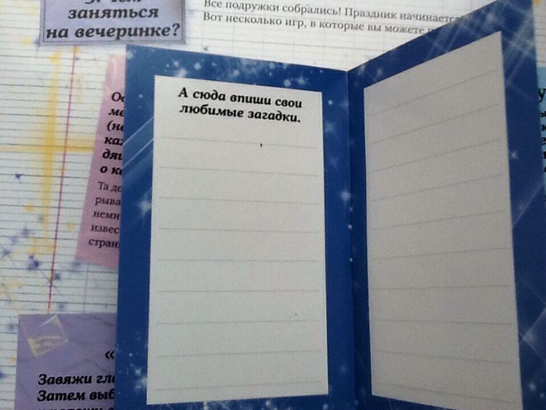 В конце книги есть блокнот, а в нем: красивая бумага, карточки - приглашения на вечеринку.