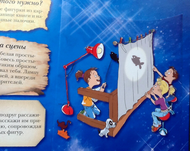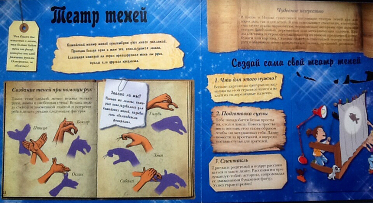 Театр теней. Китайский театр теней существует уже много столетий. Принцип всегда один и тот же: используется лампа, благодаря которой на экран проецируется тень от руки, куклы или другого предмета. ( в кармашке есть фигуры для домашнего театра теней)