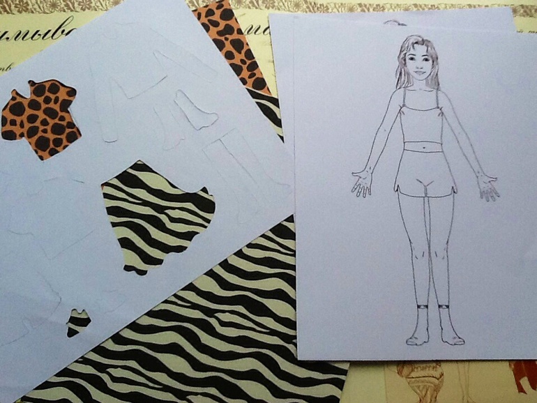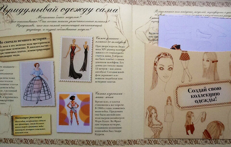 На первой страничке - моделирование одежды. Можно представить себя начинающим дизайнером и создавать собственные модели. А в кармашке на страничке есть модели, трафареты с деталями одежды и обуви, а так же листы бумаги с различными рисунками.