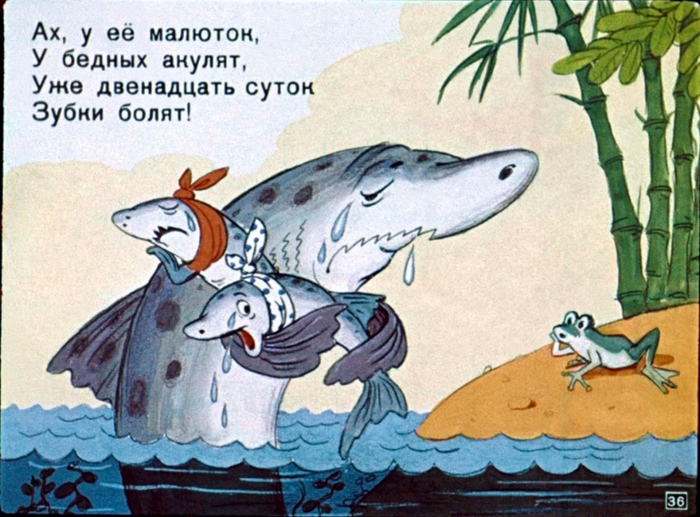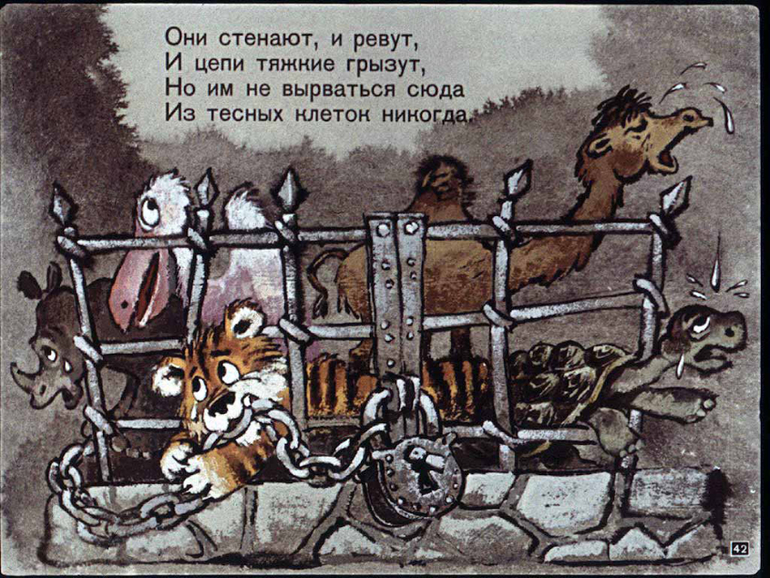 Еще для меня этот диафильм стал определяющим в подборе книг для своего ребенка. У меня есть воспоминание детства: я сижу перед фильмоскопом, читаю "Крокодила" и - ничего толком не понимаю. То есть я вижу по картинкам, что происходит: Крокодил всех ест, мальчик его прогоняет (мальчик страшный, видно, что драчун), звери нападают на людей, несчастные звери томятся в клетке, и их бесконечно жалко - то есть пересказать, если что, я все могла. Но сюжет в голове не складывался: Крокодил и Ваня одинаково пугали; за кого болеть, непонятно; зверей почему-то не выпускают из клетки, хотя они там явно мучаются; крокодила вроде прогнали, а он опять тут. Судьба Тотоши и Кокоши виделась как страшная трагедия - сначала дерутся, потом болеют, потом плачут, потом старшие звери отнимают елочку, их единственный подарок. Поэтому я совсем не спешу читать своему ребенку длинные сюжетные истории, где причины поведения героев нужно объяснять, так что Буратино, Незнайка, Кошкин дом, Конек-Горбунок и прочие не явятся раньше школьного возраста.