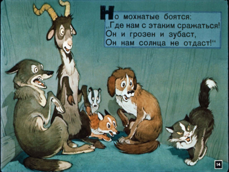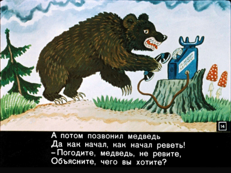 Сразу же видно и одно из главных достоинств диафильмов - нарисовано ровно то, что написано. Если уж в тексте фигурируют "и жучок, и червячок, и медведица" - будьте спокойны, все они нарисованы.