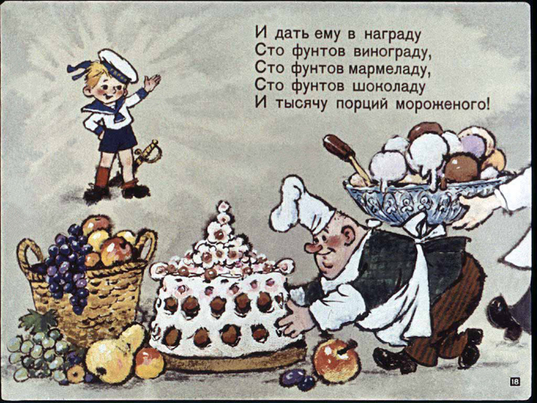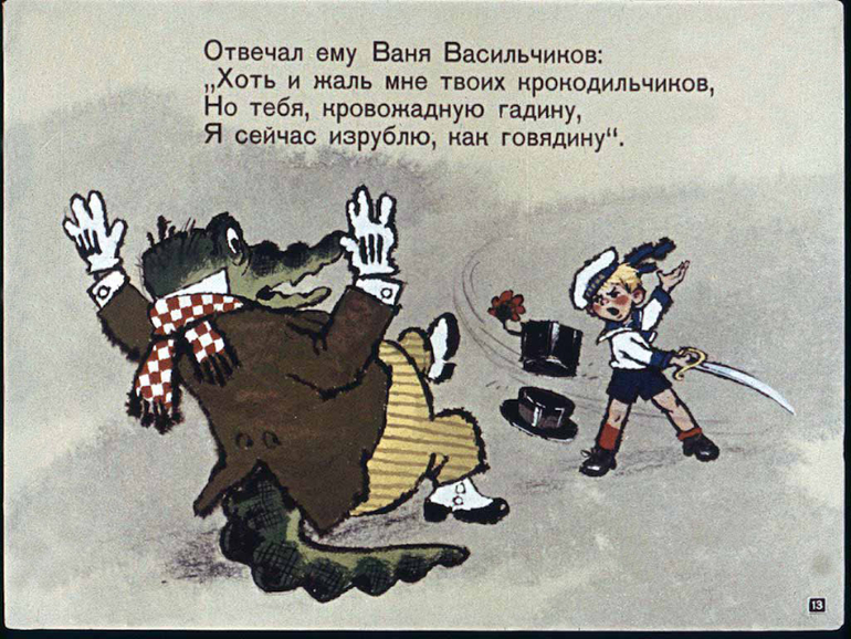 Один из лучших диафильмов вообще; иллюстрации из тех, что запоминаются на всю жизнь. И это не просто фигура речи: диафильм этот был у меня в детстве, и иллюстрации я хорошо помню: и Ваню Васильчикова, разрубающего цилиндр Крокодила (помнится, долгое время я еще мечтала купить в детском магазине такую же острую саблю), и гору сластей, и несчастных зверей в клетке.