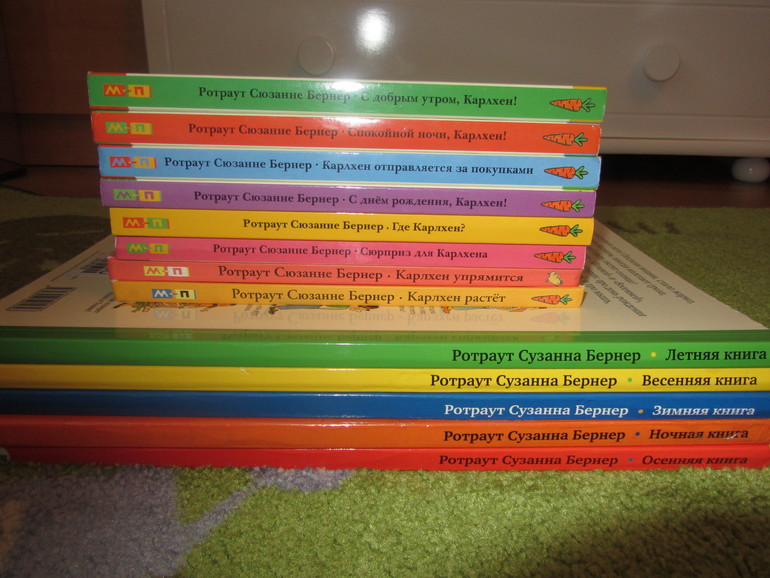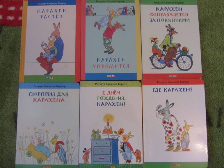 Очень большим интересом и любовью пользовались книги Ротраут Сюзанне Бернер. Эта писательница - знаток детских душ, и многие детки именно в 1,5-2 года хорошо слушают эти книги. И истории Городка, и истории про зайчика Карлхена пользовались огромной любовью моей дочки на протяжении полугода как минимум. Надо отметить, что книги выполнены в качественном картоне, что очень удобно, пока детки еще не так бережно обращаются с книгами. "Карлхен растет" и "Карлхен упрямится" чуть посложнее - для детей от 2-х лет и не в картоне, но мы читали и их. Дочка просила.