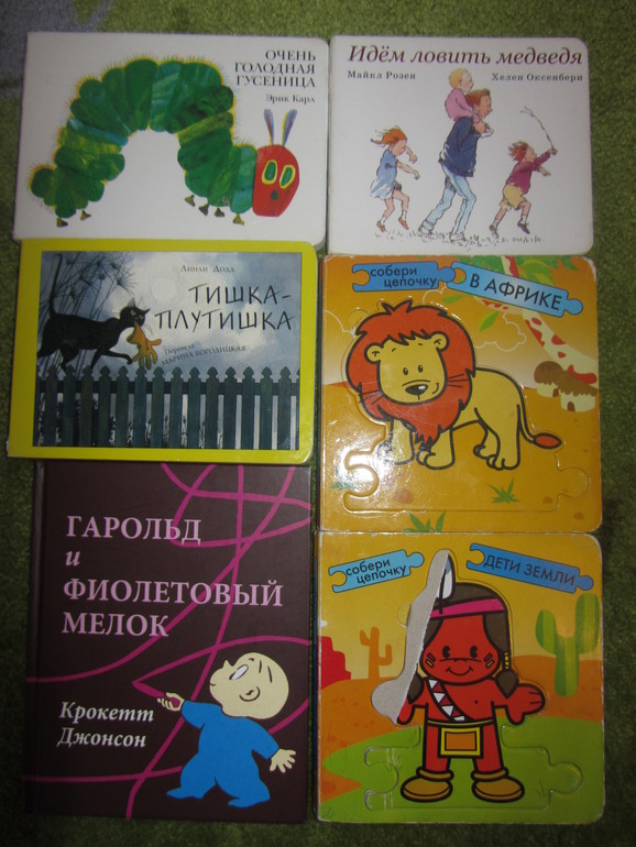 Картонки. У нас их было немного. "Очень голодная гусеница" - маст хэв на долгие годы. "Идем ловить медведя" - папина книжка, исключительно папина. Обалденная, конечно, она, полный восторг у всех - и у старших, и у младших))))