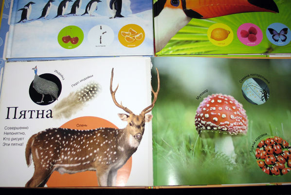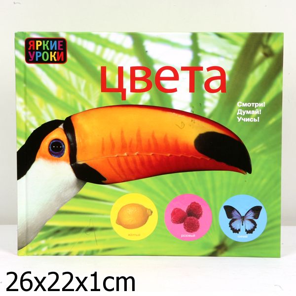 Книга хороша, хотя скорее всего уже выпустили достаточное количество подобных книг. Цвета натуральные. Но цвета мы учим по карточкам, а по книге закрепляем и расширяем наш словарный запас. Вот фото пары разворотов