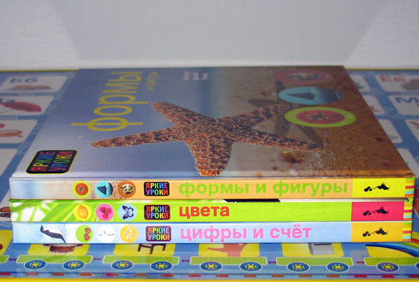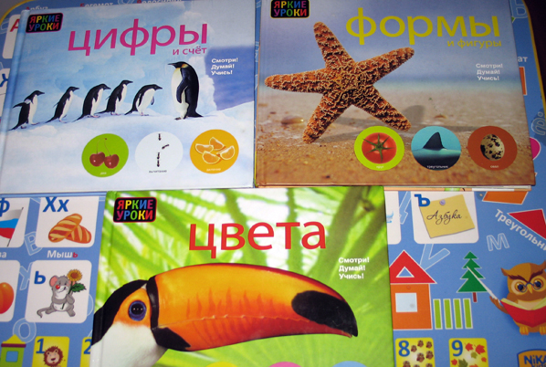 Серия "Яркие уроки" от издательства Росмэн - это развивающие книжки построенные на фото-материале. Книги помогают наглядно, просто и увлекательно обучить ребенка счету, научат узнавать геометрические фигуры, различать цвета, находить сходства и различи. Из данной серии у нас только три книги.